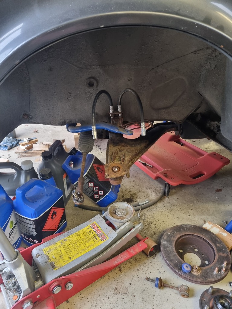 På de nyere kan man jo skru de løs i bunn og løfte hele greien ut. Samt da slipper man det tullet med bremseslanger som henger fast i fjærbeinskroppen.