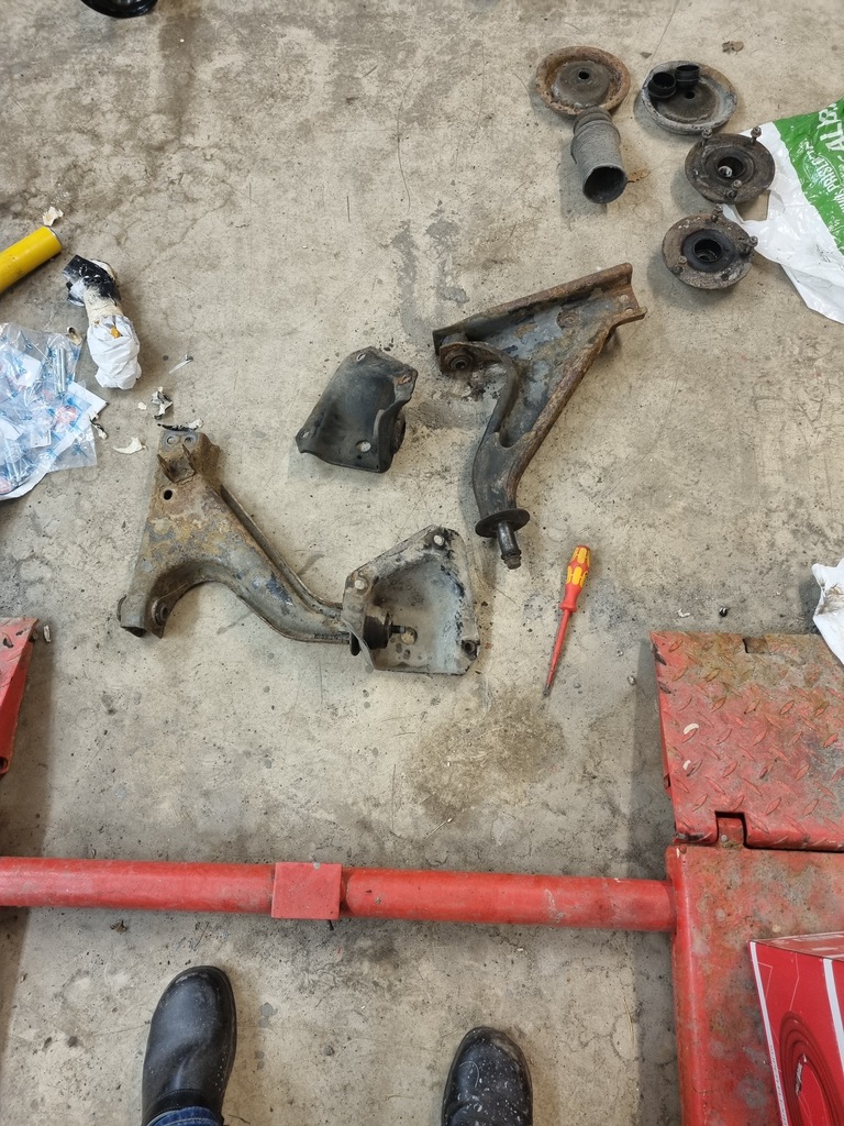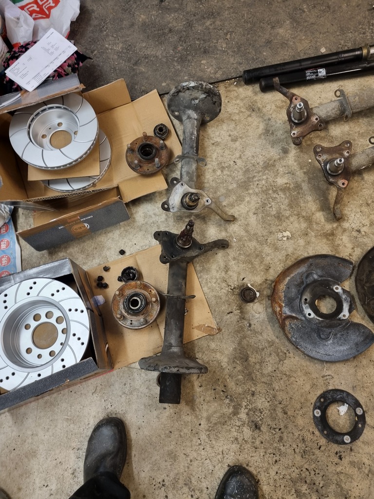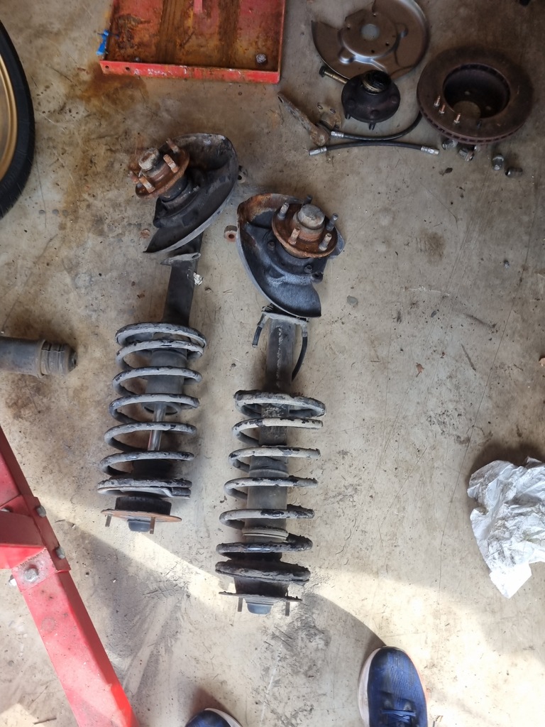 Bremseskjoldene var enkle å få av, ser ut som det er galvaniserte deler, samme med fjærbeina.