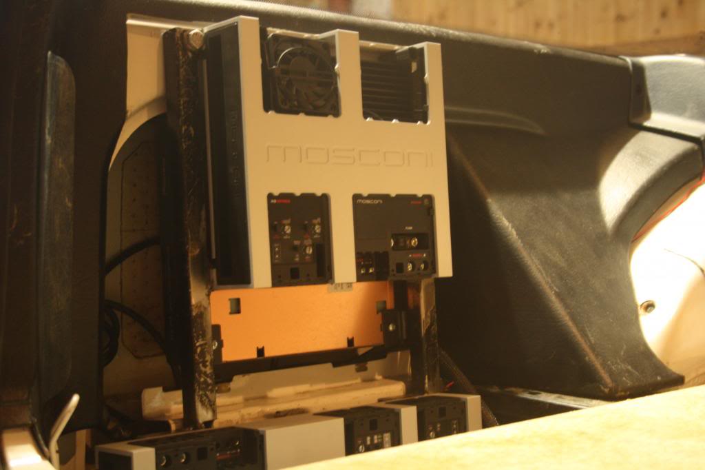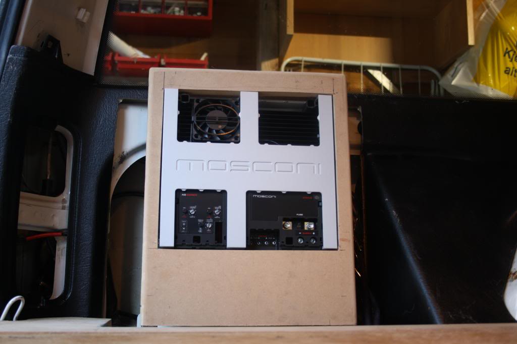 Her skal det bli plass til en 2-kanaler og en 4-kanaler til frontsettet. Dekselet lages på samme måte som på høyresiden: Rammen rundt forsterkeren lages i MDF og støpes fast til et originalt deksel med glassfiber.